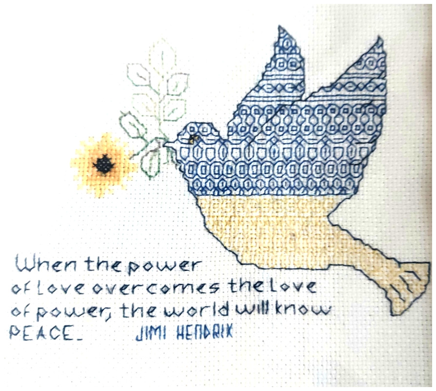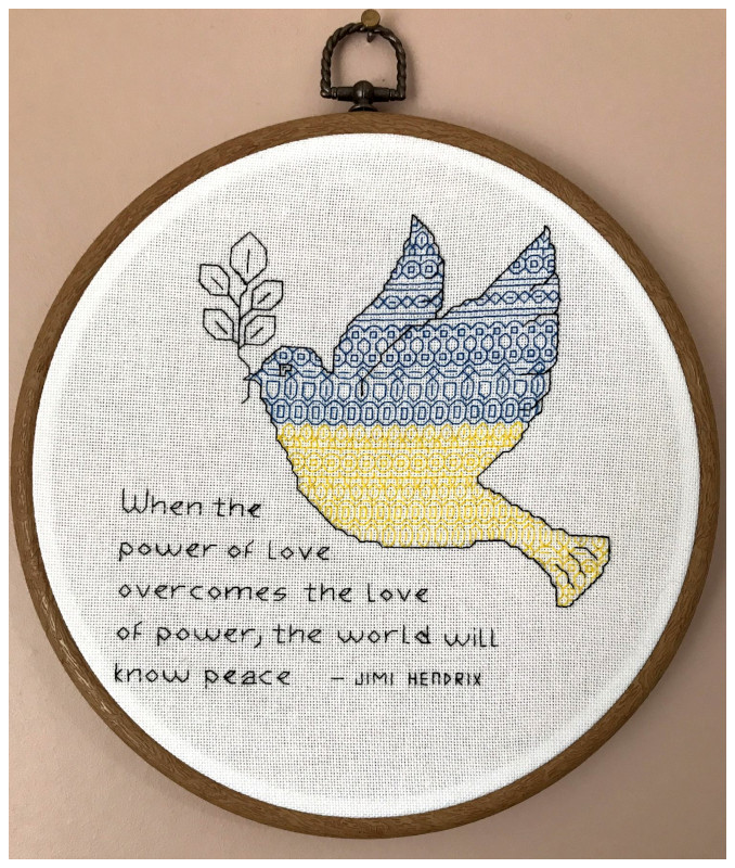 Members of our group are supporting charities working in Ukraine for peace. The dove pattern was purchased from Peppermint Purple to show our support though stitching. Copy and paste this url into your browser: https://peppermintpurple.com/collections/all-blackwork/products/peace Thanks to Sarah and Helen for sharing. The third piece is based on Ukranian symbolism designed by Do'an. Follow this link for more information: https://www.onepointmind.com/atthepoint/ukraine-solidarity-stitch-a-long
