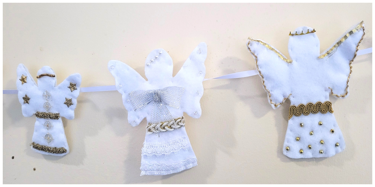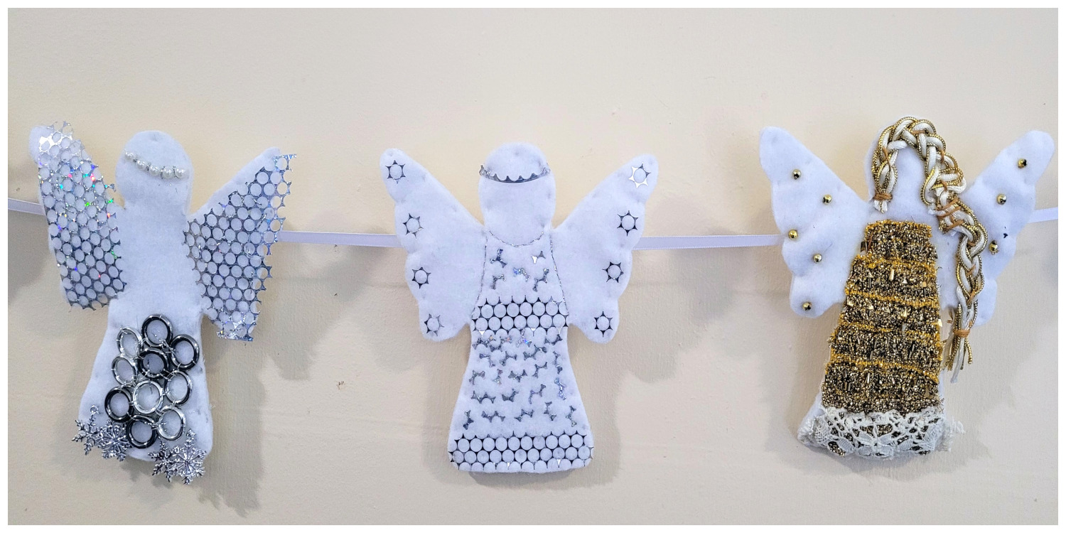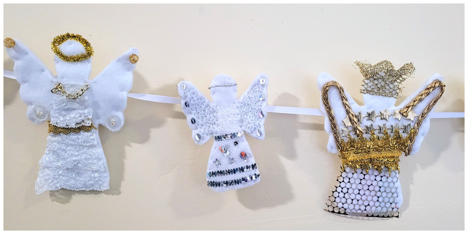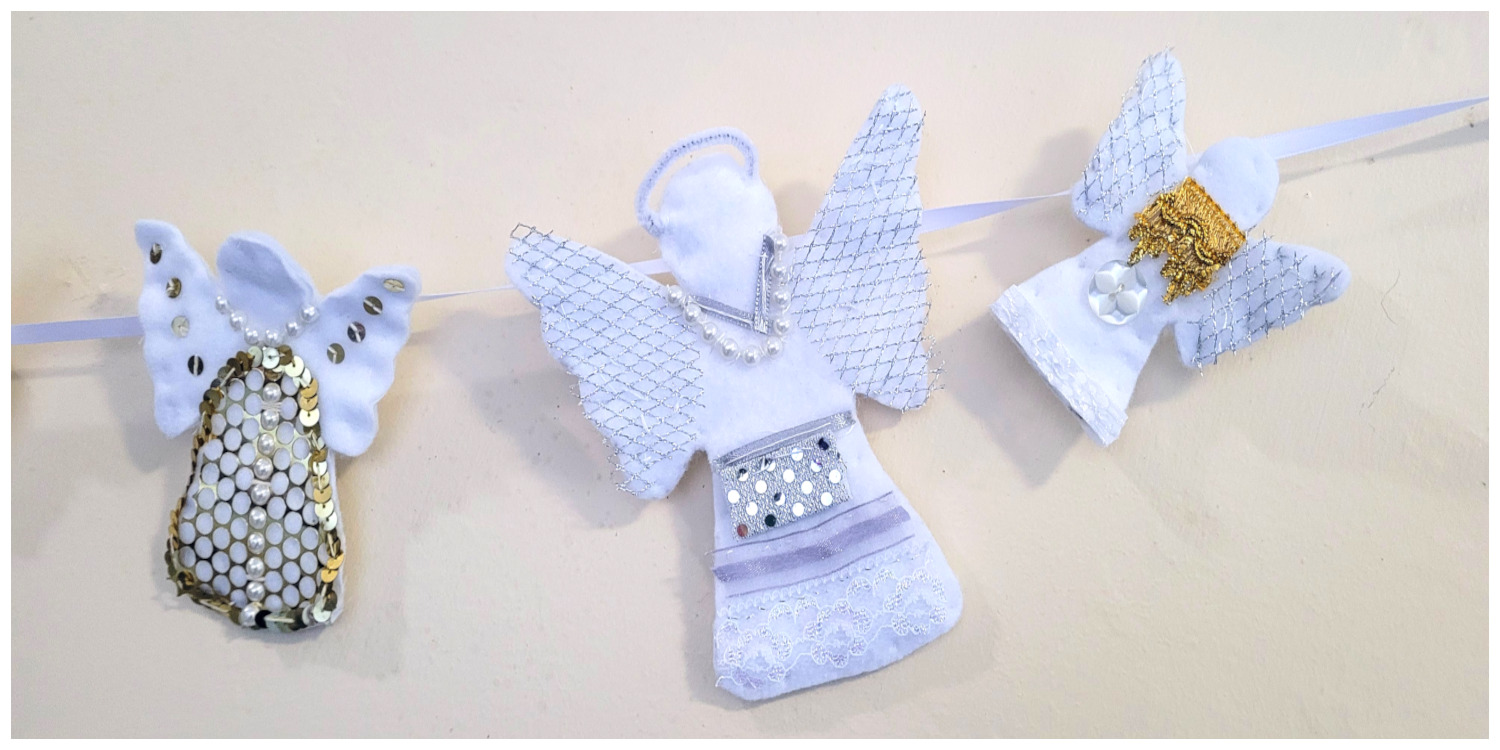 Saturday Young StitchersDo you know a young person who loves to sew, or would like to learn to stitch? Saturday Young Stitchers welcomes all abilities to hone their skills with the support of very experienced and skilled members of the ‘Take a Stitch 2 Durham’ group. All our sessions are on the THIRD SATURDAY OF THE MONTH taking place from 1pm-3pm. It is essential to pre-book a place directly with Ushaw House. For more information on fees payable and to book a place, please check the Ushaw House website: https://ushaw.org/whatson/saturday-young-stitchers/. Suitable for young people aged 7+ Please be aware, all young people MUST be accompanied by a responsible adult throughout the activity. Angels Wings and Things at Ushaw, December 2024:Our Young Stitchers have been busy again. This time they have created a wonderful display of Angels for the Ushaw Historic House annual Festival of Trees. We are very impressed by the talents and creativity of our Youngsters who have used a selection of waste materials left over from other projects. Click on the first image to scroll through a dispay of full size pictures.