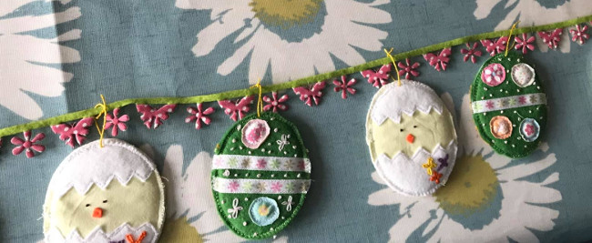 Easter Egg or Christmas tree decorations: This decoration can be as big or small as you like. Use coloured felt for the shape outline, then decorate with ribbon, beads, buttons, pieces of fabric. I used a mixture of hand and machine stitching. You can make different shapes for a chick or rabbit, or a Christmas tree or snowman. I got carried away with mine and ended up making some bunting! I decorated a front and a back for each egg and stitched them both together afterwards.