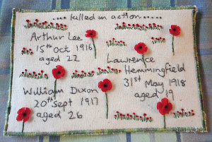 The group took part in the National '100 Hearts War Stories' project in 2018 to commemorate the ending of WWI. Here are some of the postcards the group designed and stitched for the exhibition.