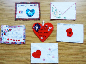 Textile Postcard Swaps: Creating a postcard sized piece of work is a fun way for youngsters who have already done a bit of stitching to be creative. You can you use small scraps of fabric and add bits of plastic from recycling. Start with a piece of backing fabric, then add more bits to it securing them with stitch. Try different stitches to keep the different pieces in place.